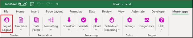 1. To log in to the More4apps Add-in, click the Login/Logout Ribbon button which will open the Login form.