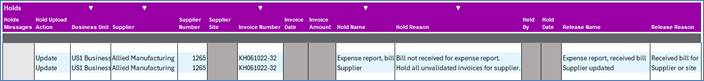 The scenario below illustrates how to Release the Holds applied to invoices. You need to repeat the Invoice information per Release.