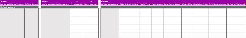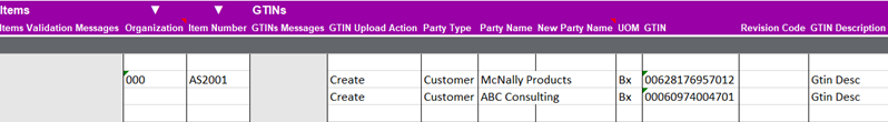 Examples do not include all critical columns. Note the ‘Create’ action at the ‘GTIN Upload Action’ for each GTIN Item.