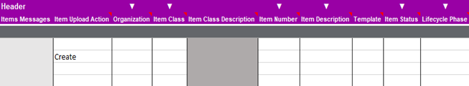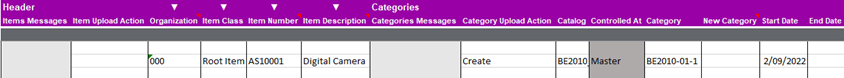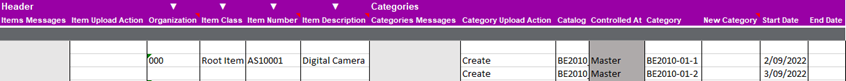 The ‘Organization’ and ‘Item Number’ fields are required to identify the item. The ‘Item Upload Action’ and Item attributes are not needed as the item record, in this example, is not being created or updated. The ‘Category Upload Action’ is required (“Create”), to upload the new category against the item.