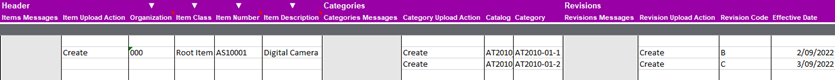 If other sections such as Categories, Revisions etc are to be included in the upload, these sections will also need the “Create” value in their respective action columns. If not, they can be left blank and no action will be taken in those sections, even if they contain other data.