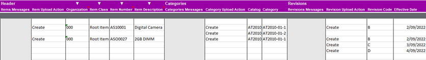 The images below illustrate layout details with multiple Categories and their Revisions. Examples do not include all critical columns. Note the “Create” action value in each section.