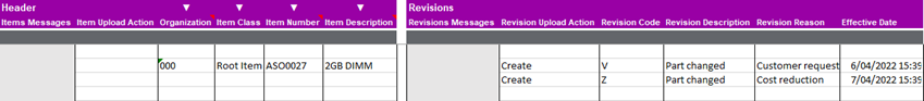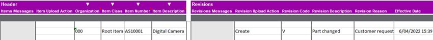 The ‘Organization’ and ‘Item Number’ fields are required to identify the item. The ‘Item Upload Action’ and item attributes are not needed as the item record, in this example, is not being created or updated. The ‘Revision Upload Action’ is required (“Create”), to upload the new revision against the item.